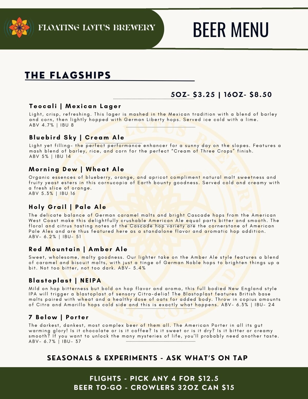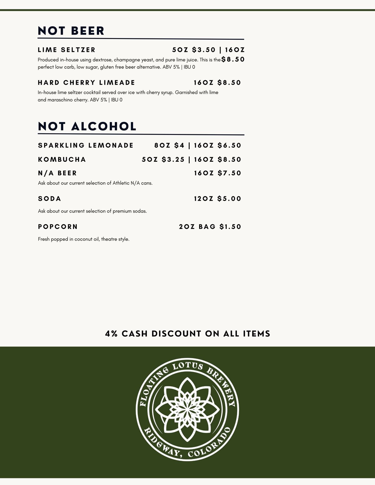 The vision for Floating Lotus Brewery was born out of a love for music, craft beer, and most importantly; community. The Floating Lotus Brewery in Ridgway, CO aims to be a "third space" for folks to gather 'round and sit a spell. Hospitality is the name of our game, and you can always expect friendly service. A relaxed and comfortable atmosphere lends itself to fostering meaningful conversations, encouraging collaboration, and promoting a sense of connectedness. Our goal is to be enmeshed in the vibrant community of Ridgway, and contribute to its flourishing arts and music scene. We hope to be a staple for locals and visitors alike.